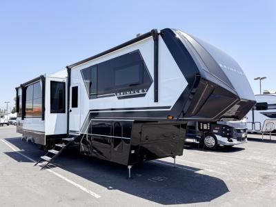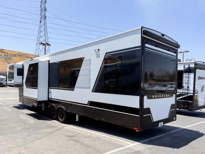 Unmatched luxury, an automotive exterior, tons of storage space, and intelligent features; it has to be a Model G toy hauler fifth wheel by Brinkley!