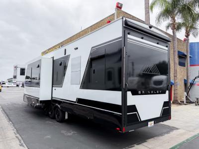 With any Model G toy hauler fifth wheel by Brinkley you will enjoy luxurious amenities, tons of storage space, and innovative features that have been developed and tested in the real world. Durable construction includes an industry leading PDI process, an industry best insulation package, and reinforced and walkable slide roofs. Some of the exterior features you'll find are a 3-way pass-through with a multi-functional flip-up bulkhead wall, under I-beam storage, a MAX-Vision reverse lighting system, and a low-maintenance roof to name a few. A Rockford Fosgate audio system comes standard, along with a OneControl app system that lets you control your fifth wheel's functions right from your mobile device. You will find the solar system with a designated storage area to be ultra convenient, plus there is a FlexPower 5500 with a dual fuel inverter generator for all your power needs. Head inside to find a residential interior with Brinkley's CraftSense wood trim construction, floating entrance steps, integrated window screens and insulated blackout blinds, and residential solid surface countertops plus backsplash. You will also enjoy the neon shower lighting and recessed medicine cabinets in the bath, plus motion activated LED bed lights and dual bedside outlets in the bedroom. Choose a Model G toy hauler fifth wheel to experience all the luxury it has to offer!