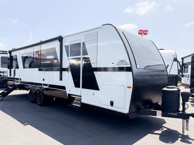 Grab the whole gang and head to the campground in this bunkhouse travel trailer! The 48" x 74" bunks can sleep two to four, and there is a floor to ceiling storage cabinet with drawers, a top bunk window, outlets and USB ports, plus double space-saving pocket doors. Up front you'll find the master bedroom with a 66" x 80" king bed and a MaxSpace Split-Level Wardrobe, TV prep, your own exterior entry door, plus quick access to the walk-thru bath. Everyone can meet in the combined kitchen and living room to relax on the theater seating or tri-fold sofa, and there is pull-out dining table with a drawer and a window above for great outdoor views. The outside is just as accommodating as the inside with its exterior speakers, LED chassis lighting, rear storage compartment with dual access doors, and exterior 12V refrigerator for cold drinks!