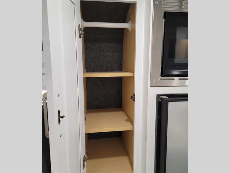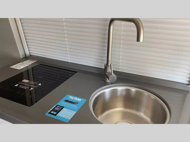 The interior will have you feeling right at home with hardwood cabinetry, an induction cooktop, plus a MaxxAir fan with a rain sensor and remote for added convenience. All of your power needs will be met with the RV QG 800i 2.8kW gas generator and the 195-watt solar panel with dual charging capabilities, or you can choose the optional Li3 Lithium battery system for unmatched power.