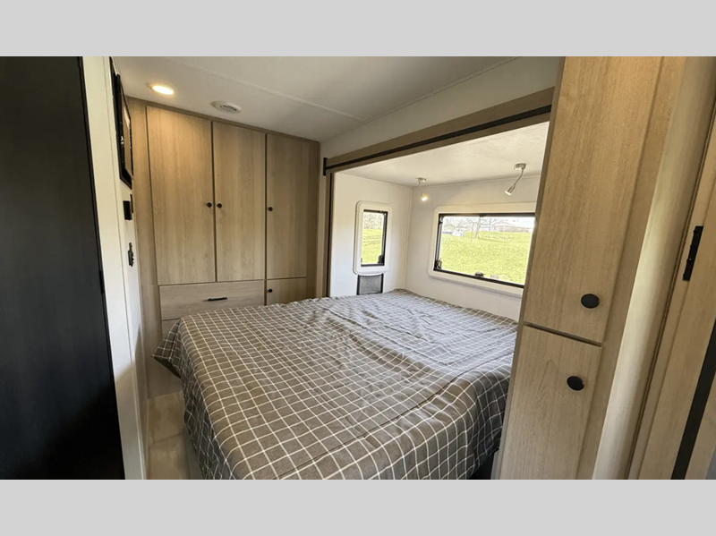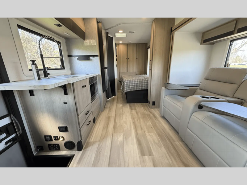 Each is built with aluminum framed laminated sidewalls and Superlite composite substrate that is water resistant, lighter than plywood, and better insulated. The interior offers power leather swivel driver and passenger seats in the cab area, soft touch self-closing drawer guides in the kitchen, a motion sensor light in the bathroom, and a 12V TV in the bedroom.