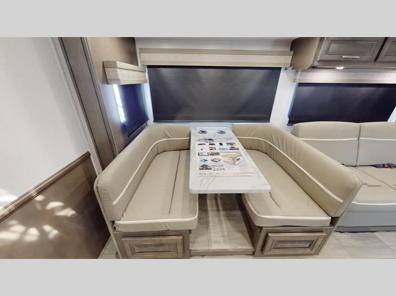You will love the features that come standard on each model, like the hydraulic 4-point leveling system, color side and rear cameras, thermal foil kitchen countertops, and an LED TV in the living room to name a few. The durable construction includes a one-piece fiberglass roof, aluminum framed vacuum bonded floors, and high density block foam insulation so you can enjoy your coach for years to come. And we haven't even mentioned the exterior conveniences; a solar panel with a controller, a power awning with LED lights, an outside entertainment center, and more!