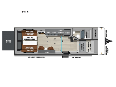 The open garage-to-living layout keeps everything connected while still giving you defined areas to relax, sleep, and entertain. In the rear, the electric pass thru dinette quickly adapts from dining space to additional seating or sleeping, making the garage area work for both cargo and guests. Moving forward, the entertainment center creates a natural gathering point for relaxing after a day on the trails. Along the side, the Murphy bed provides a comfortable place to rest at night while folding away during the day to keep the interior feeling open and usable. Outside, the 18' awning extends your living space into the outdoors, offering shade and protection so you can enjoy meals, conversation, or downtime in comfort.