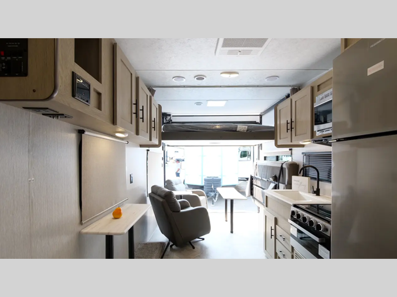Sleeps 5 Length 32 ft 2 in Ext Width 8 ft Ext Height 11 ft 5 in Hitch Weight 950 lbs Dry Weight 6418 lbs Cargo Capacity 4732 lbs Fresh Water Capacity 61 gals Grey Water Capacity 32 gals Black Water Capacity 32 gals Number Of Bunks 1 Available Beds Custom King with Versa-Tilt Refrigerator Type 12V Number of Awnings 1 Garage Size 14 ft 3 in Water Heater Type Tankless AC BTU 13500 btu Awning Info 20' with 4K Blade Lighting Axle Count 2 Shower Type Standard Similar Floorplans