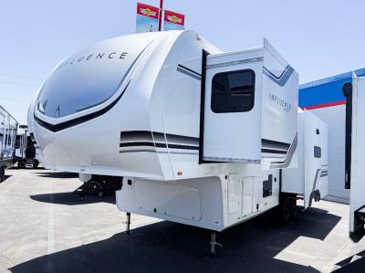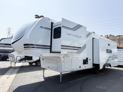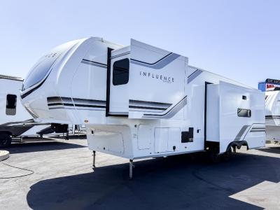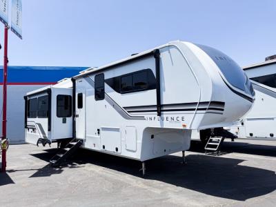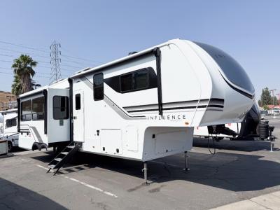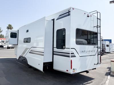 Any Grand Design Influence fifth wheel features five-sided aluminum cage construction with a walk-on roof and a fully enclosed underbelly with heated tanks and storage for all weather camping. For peace of mind, the MORryde CRE3000 Suspension system will provide safe and smooth towing, and the 101" widebody construction offers all the room you need and that is before multiple slides are fully engaged. You will appreciate the Keyed-Alike locks, slam-latch baggage doors with magnetic door catches, exterior security light, and SolidStep entry steps. On the inside, Congoleum flooring, premium roller shades for privacy, a hallway handrail for safety, and nightstands with USB ports to keep all of your electronics fully charged. You will also love the On Demand tankless water heater when showering, plus the added heat and ambiance from an electric fireplace, and so much more!