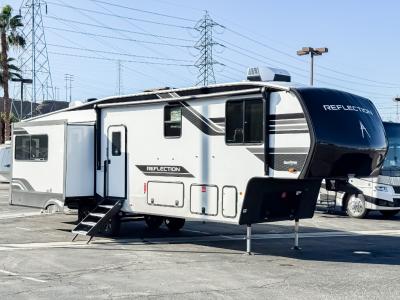 With any Reflection fifth wheel by Grand Design, you will have a solar panel for off-grid camping and a 60 amp charge controller and inverter prep, a Universal All-In-One docking station, unobstructed pass-through storage, and Goodyear Endurance tires. Each is constructed of gel coat exterior sidewalls, residential 5" truss rafters, walk-on roof decking, a fiberglass and radiant foil roof and front cap insulation plus laminated aluminum framed side walls, roof and end walls in slide rooms. Head inside to enjoy residential hardwood cabinet doors, premium Congoleum flooring, a spacious shower with a glass door, and many more comforts!
