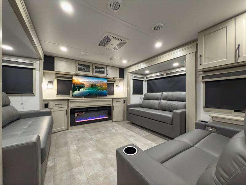 Sleeps 6 Slides 4 Length 42 ft 10 in Ext Width 8 ft 5 in Ext Height 13 ft 5 in Int Height 8 ft 1 in Exterior Color Standard Graphics or Aurora, Midnight, Pearl Full-Body Paint Options Hitch Weight 3200 lbs GVWR 23500 lbs Dry Weight 19000 lbs Fresh Water Capacity 83 gals Grey Water Capacity 159 gals Black Water Capacity 106 gals Tire Size ST215/75R 17.5 LRH Furnace BTU 35000 btu Number Of Bunks 2 Available Beds Queen Refrigerator Type Stainless Steel Refrigerator Size 20 cu ft Cooktop Burners 3 Shower Size 60" x 30" Number of Awnings 3 Axle Weight 8000 lbs LP Tank Capacity 30 lbs. Water Heater Type Tankless On Demand AC BTU 30000 btu TV Info LR LED 50" Smart TV, BR 40" TV, BNKRM 40" TV, EXT 50" TV Awning Info 15’ 5”, 7’ and 15’ 5" Power w/Integrated LED Lighting Axle Count 2 Number of LP Tanks 2 Shower Type Tub/Shower Combo Electrical Service 50 amp Similar Floorplans