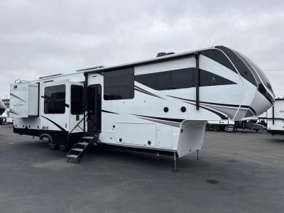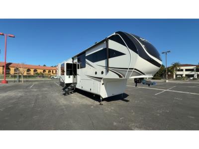 Sleeps 6 Slides 5 Length 42 ft 5 in Ext Width 8 ft 5 in Ext Height 13 ft 5 in Int Height 8 ft 1 in Exterior Color Standard Graphics or Aurora, Midnight, Pearl Full-Body Paint Options Hitch Weight 2794 lbs GVWR 19000 lbs Dry Weight 14562 lbs Fresh Water Capacity 81 gals Grey Water Capacity 106 gals Black Water Capacity 53 gals Tire Size ST215/75R 17.5 LRH Furnace BTU 35000 btu Available Beds Queen Refrigerator Type 12V Refrigerator Size 20 cu ft Cooktop Burners 4 Shower Size 48" x 30" Number of Awnings 1 Axle Weight 8000 lbs LP Tank Capacity 30 lbs. Water Heater Type Tankless On Demand AC BTU 30000 btu TV Info LR LED Smart TV Awning Info 16' Power w/Integrated LED Lighting Axle Count 2 Washer/Dryer Available Yes Number of LP Tanks 2 Shower Type Shower w/Seat Electrical Service 50 amp Similar Fifth Wheel Floorplans