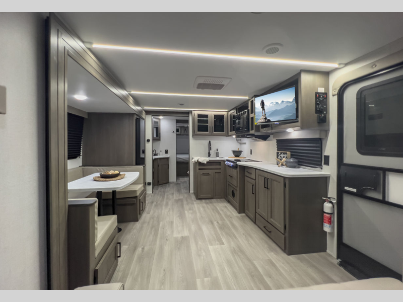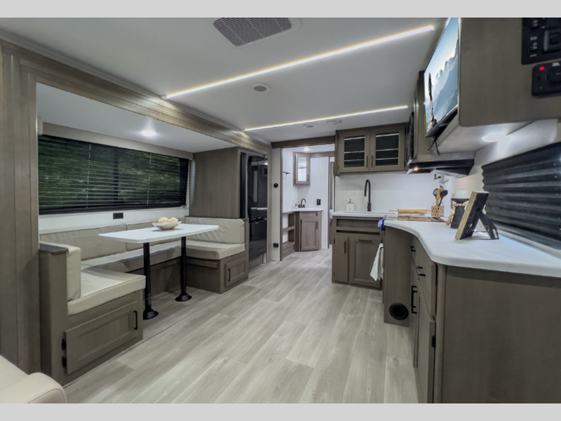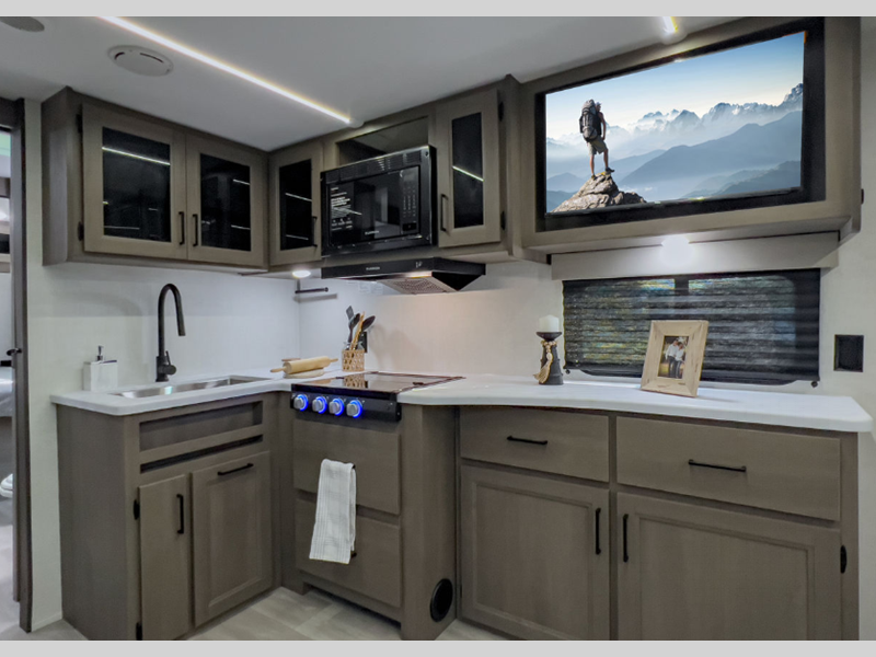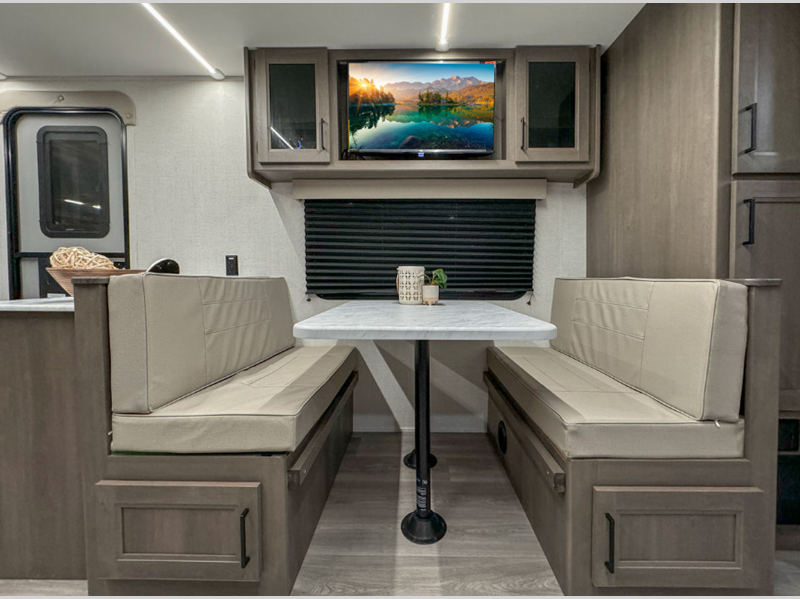 The 4-Season Protection Package includes a heated and enclosed underbelly with suspended tanks, a 35k BTU furnace, EvenFlow ductless heating throughout, and more features that help extend your camping season. There is a 6' 6" interior height to give you plenty of head room, and the thermoformed and seamless countertops in the kitchen will be easy to keep clean. You will also find many exterior conveniences, such as a universal docking station, a bottle opener and Leash Link for you furry friends, and a power tongue jack so you can easily hitch up when you're ready to go home.