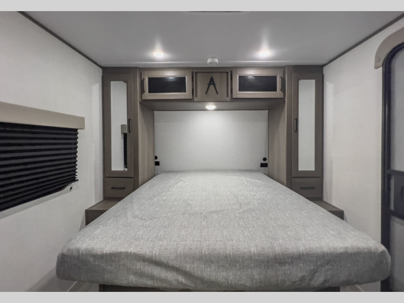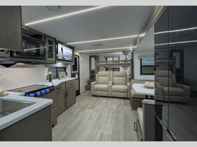Sleeps 9 Slides 1 Length 35 ft 11 in Ext Width 8 ft Ext Height 11 ft Int Height 6 ft 6 in Hitch Weight 803 lbs GVWR 8995 lbs Dry Weight 7383 lbs Fresh Water Capacity 56 gals Grey Water Capacity 78 gals Black Water Capacity 39 gals Tire Size ST225/75R15LRE Furnace BTU 35000 btu Number Of Bunks 2 Available Beds Queen, Full Refrigerator Type 12V French Door Refrigerator Size 10.7 cu ft Convection Cooking Yes Cooktop Burners 3 Number of Awnings 1 LP Tank Capacity 20 lbs Water Heater Type Furrion Tankless AC BTU 15000 btu TV Info LR 32" TV Awning Info 20' Power w/LED Light Axle Count 2 Number of LP Tanks 2 Shower Type Standard Electrical Service 50 amp Similar Floorplans