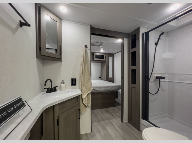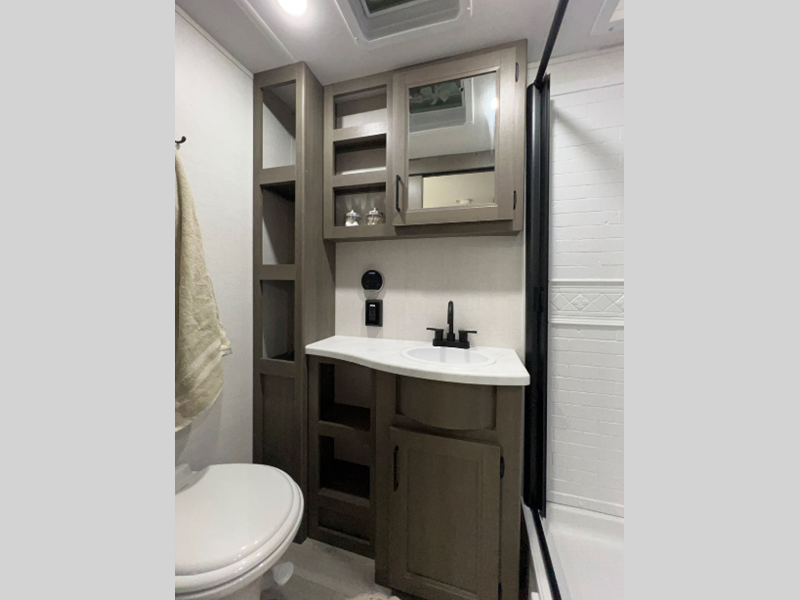 Sleeps 6 Slides 1 Length 30 ft 8 in Ext Width 8 ft Ext Height 11 ft Int Height 6 ft 6 in Hitch Weight 668 lbs GVWR 7695 lbs Dry Weight 6456 lbs Fresh Water Capacity 56 gals Grey Water Capacity 78 gals Black Water Capacity 39 gals Tire Size ST205/75R15LRD Furnace BTU 35000 btu Available Beds Queen Refrigerator Type 12V French Door Refrigerator Size 10.7 cu ft Convection Cooking Yes Cooktop Burners 3 Number of Awnings 1 LP Tank Capacity 20 lbs Water Heater Type Furrion Tankless AC BTU 15000 btu TV Info LR 32" TV Awning Info 17' Power w/LED Light Axle Count 2 Number of LP Tanks 2 Shower Type Standard Electrical Service 50 amp Similar Floorplans