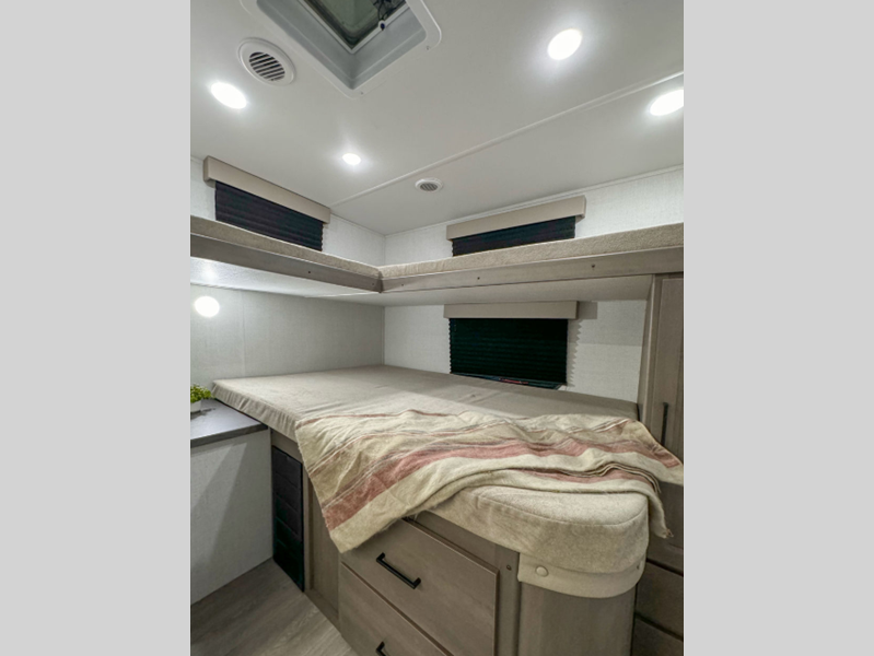 Sleeps 8 Slides 1 Length 32 ft 9 in Ext Width 8 ft Ext Height 11 ft Int Height 6 ft 6 in Hitch Weight 658 lbs GVWR 7995 lbs Dry Weight 6327 lbs Fresh Water Capacity 56 gals Grey Water Capacity 78 gals Black Water Capacity 39 gals Tire Size ST225/75R15LRE Furnace BTU 35000 btu Number Of Bunks 2 Available Beds Queen Refrigerator Type 12V French Door Refrigerator Size 10.7 cu ft Convection Cooking Yes Cooktop Burners 3 Number of Awnings 1 LP Tank Capacity 20 lbs Water Heater Type Furrion Tankless AC BTU 15000 btu TV Info LR 32" TV Awning Info 16' Power w/LED Light Axle Count 2 Number of LP Tanks 2 Shower Type Standard Electrical Service 50 amp Similar Floorplans