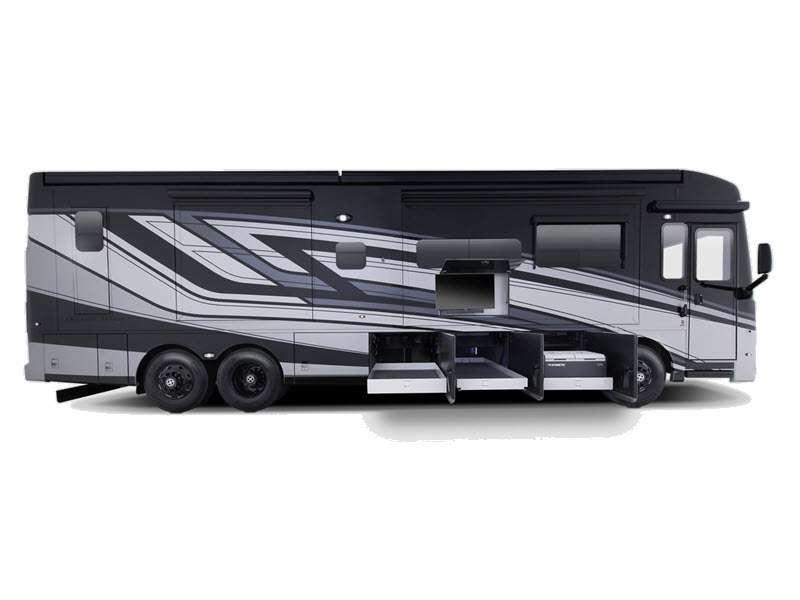 Sleeps 4 Slides 3 Length 43 ft 9 in Ext Width 8 ft 6 in Ext Height 13 ft 1 in Int Height 6 ft 11 in Interior Color Palmer, Baltra, Catalina, Stratton Exterior Color Breda, Delft, Lisse, Tillberg Hitch Weight 15000 lbs GVWR 51000 lbs Dry Weight 38200 lbs Cargo Capacity 12800 lbs Fresh Water Capacity 105 gals Grey Water Capacity 75 gals Black Water Capacity 55 gals Furnace BTU 50000 btu Generator 10.0 Kw Onan Fuel Type Diesel Engine Cummins 8.9L Chassis Freightliner Tag Axle Horsepower 450 hp Fuel Capacity 150 gals Wheelbase 288 in Available Beds King Torque 1250 ft-lb Refrigerator Type Whirlpool Refrigerator Size 19.7 cu ft Convection Cooking Yes Cooktop Burners 3 Shower Size 48" x 36" Number of Awnings 1 Axle Weight Front 19000 lbs Axle Weight Rear 20000 lbs Axle Weight Tag 12000 lbs LP Tank Capacity 22 gals Water Heater Type Demand AC BTU 45000 btu TV Info LR Samsung LED TV, BR Samsung LED TV Awning Info Girard® G2000 power with wind sensor, remote control & LED lights Washer/Dryer Available Yes Gross Combined Weight 66000 lbs Shower Type Wheelchair Accessible Electrical Service 50 amp Similar Floorplans