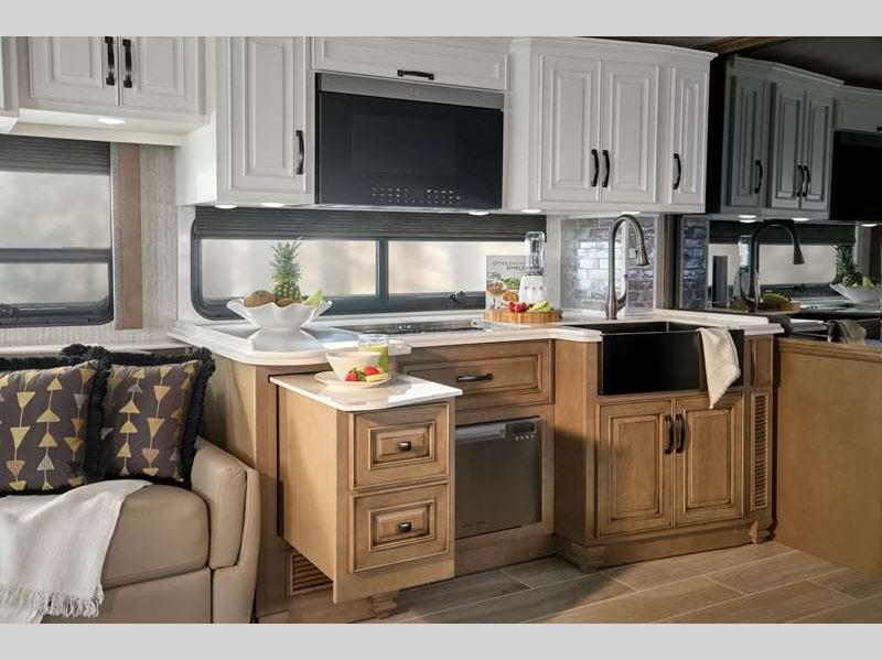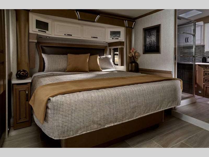 The exterior full-paint Masterpiece Finish is an industry exclusive, and it will attract every eye on the road. These luxurious coaches are absolutely filled to the brim with enticing amenities, like the convection microwave, Samsung LED TV, Bose sound bar sound system, and Xite dash radio with 9" monitors. There is also a Nav-N-Go navigation system, Villa Comfort Fit furniture, plush pillowtop mattress, and wireless phone charging mat.