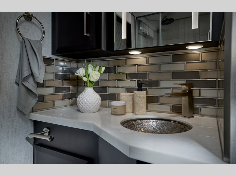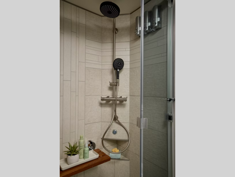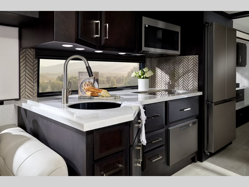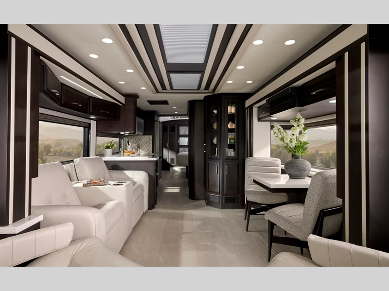 Each is built on a Freightliner or Spartan chassis with an electronic stability control, and Comfort Drive™ steering for a smooth drive. Safety features such as the Mobile Eye lane tracking and departure warning system, On Guard collision mitigation adaptive cruise system with following distance control, tire pressure display on the glass dash. The luxurious interior includes tile flooring throughout, the Suede finish hardwood cabinets, super polished solid surface countertops and more!