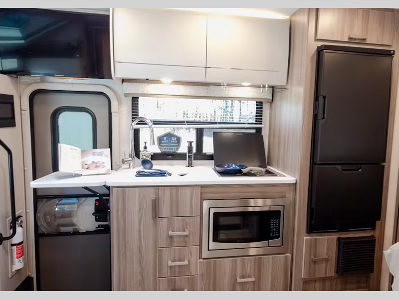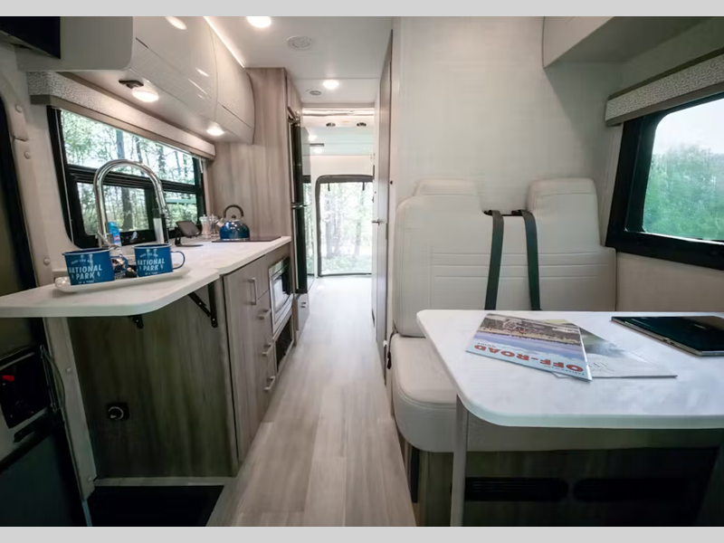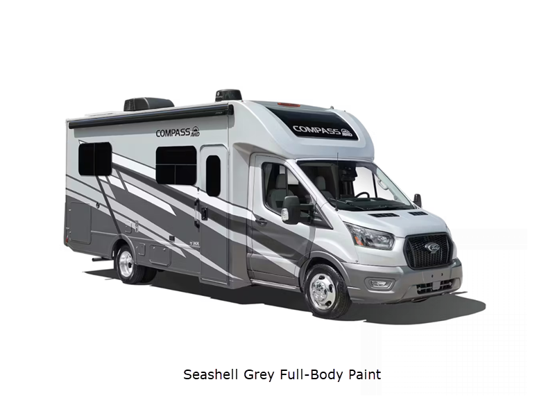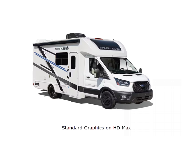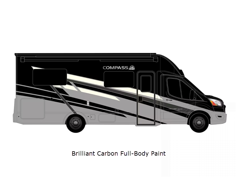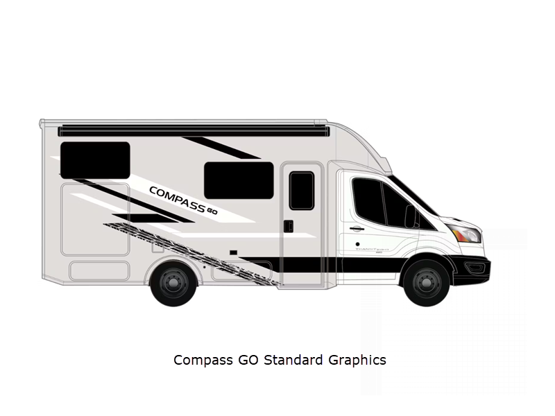Sleeps 3 Slides 1 Length 23 ft 7 in Ext Width 7 ft 6 in Ext Height 11 ft Int Height 6 ft 8 in Interior Color Freshwater Pearl, Snow Leopard Exterior Color Standard Graphics on HD Max. Brilliant Carbon, River Ranch, Seashell Grey Full-Body Paint Choices Hitch Weight 5000 lbs GVWR 11000 lbs Fresh Water Capacity 31 gals Grey Water Capacity 37 gals Black Water Capacity 19 gals Furnace BTU 19000 btu Generator 50 State 4.0 kW Gas Fuel Type Gasoline Engine 3.5L V6 EcoBoost Turbo Chassis Ford Transit AWD Horsepower 310 hp Fuel Capacity 25 gals Wheelbase 156 in Available Beds Flip-Up RV Queen Torque 400 ft-lb Refrigerator Type 12V Dual Door Convection Cooking Yes Cooktop Burners 2 Shower Size 24" x 32" Number of Awnings 1 LP Tank Capacity 40.9 lbs Water Heater Type Tankless AC BTU 15000 btu Basement Storage 15.1 cu. ft. TV Info LR 32" Smart TV, BR 32" Smart TV Awning Info 14' Power w/Integrated LED Lighting Gross Combined Weight 15000 lbs Shower Type Standard Electrical Service 30 amp -