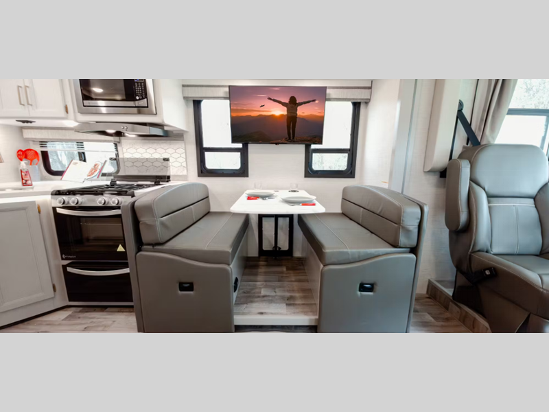 You'll find many features that will make the Resonate feel just like home, like the residential vinyl flooring that is also pet-friendly, the comfortable Dream Dinette with cupholders, and the open living spaces with large windows to let natural light in. Outside, there is a basement pass-through storage for your gear, a power awning with integrated LED lighting, and an exterior TV to enjoy the big game outdoors. There is even a Pet-Link multipurpose tie-down for your furry friends!