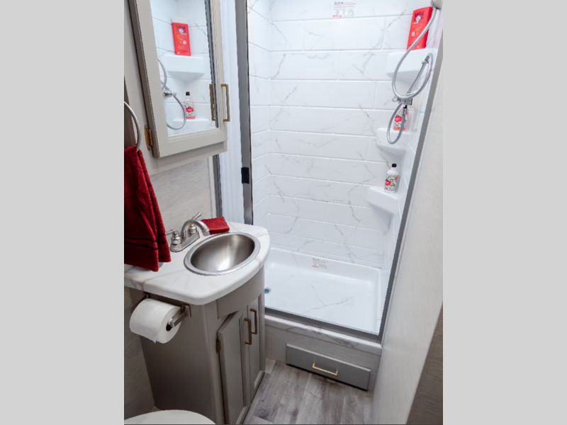 Sleeps 6 Slides 1 Length 30 ft 9 in Ext Width 8 ft 3 in Ext Height 12 ft 2 in Int Height 7 ft Interior Color Boardwalk, Starry Night Exterior Color Standard Graphics Hitch Weight 8000 lbs GVWR 18000 lbs Fresh Water Capacity 50 gals Grey Water Capacity 40 gals Black Water Capacity 40 gals Tire Size 19.5" Furnace BTU 35000 btu Generator Onan RV GQ 4000 Gas Fuel Type Gas Engine 7.3L V8 Chassis Ford F-53 Horsepower 335 hp Fuel Capacity 80 gals Wheelbase 190 in Number Of Bunks 1 Available Beds King Torque 468 ft-lb Refrigerator Type 12V DC Double Door Cooktop Burners 3 Shower Size 24" x 36" Number of Awnings 1 LP Tank Capacity 88 lbs Water Heater Type Tankless AC BTU 27000 btu Basement Storage 66 cu. ft. TV Info LR 40" LED Smart TV, BR 32" LED Smart TV, Ext. 32" TV Awning Info 19' Power w/Integrated LED Lighting Gross Combined Weight 23000 lbs Shower Type Standard Electrical Service 50 amp Similar Floorplans