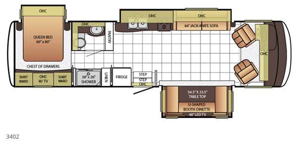 As you enter the Bay Star 3402 motor home by Newmar you will find a u-shaped booth dinette slide with a 48" LED TV above the dinette. To the left of the entrance there is a refrigerator. On the opposite side of the motor home the slide has a jack-knife sofa, three burner range, and double kitchen sink. Next to the slide you will find a large pantry.