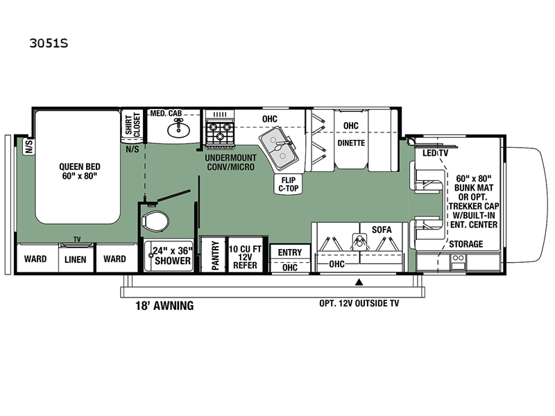 | TV Info | LR LED, BR 12V, Bunk LED | Awning Info | 18' Power w/ LED Lights |